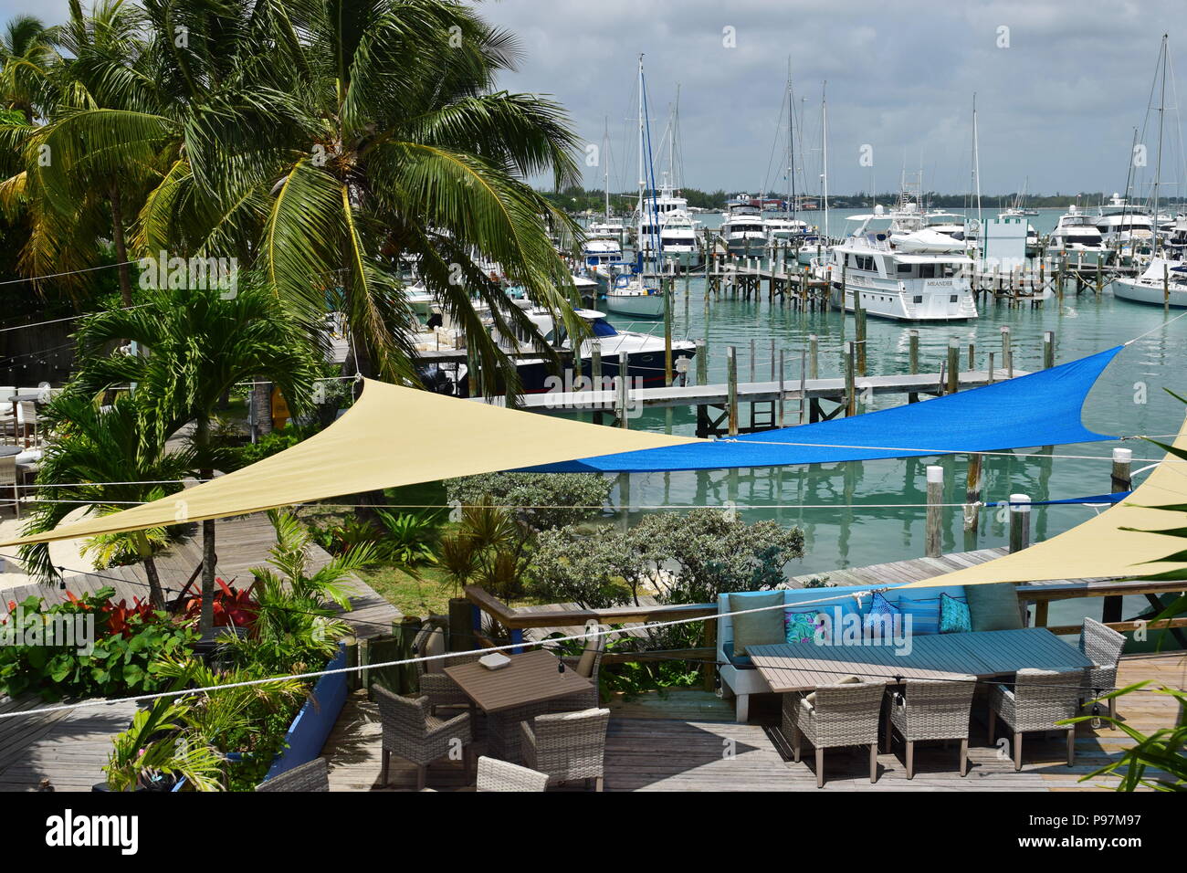 Outdoor Deck And Restaurant On Marina In Marsh Harbour Abaco Island Bahamas On Sunny Day With Yachts And Boats Anchored Stock Photo Alamy